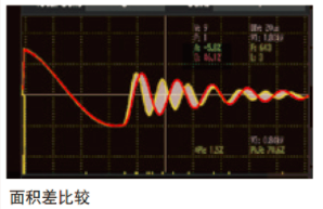 面積比較可用來檢測鉛酸電池芯的正負(fù)極板之間是否絕緣不良或隔離膜不存在。面積比較是將測試的波形總面積與樣品的波形總面積做差異比較,總面積的差異表現(xiàn)出了電池芯絕緣程度的好壞。當(dāng)電池芯正負(fù)極板之間的絕緣不良或是隔離膜不存在時,在足夠的電場強(qiáng)度/電壓下會造成放電,瞬間的能量釋放導(dǎo)致波形瞬間快速衰減, 所以測試的波形總面積會比樣品的波形總面積小。