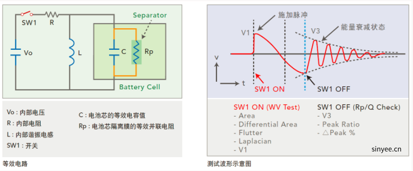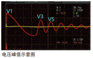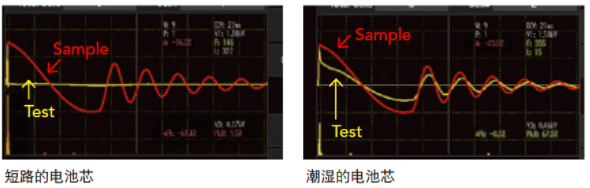 諧振波形中的第一個電壓峰值。當(dāng)電池芯正負(fù)極板之間的絕緣不良或是隔離膜不存在時,在足夠的電場強(qiáng)度/電壓下會造成放電,會導(dǎo)致第一個電壓峰值比樣品的第一個電壓峰值低。